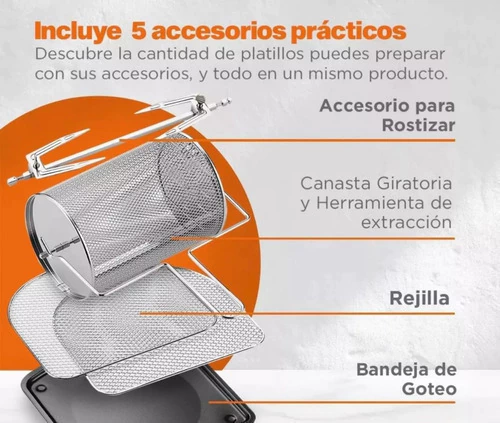 Este increíble producto viene con parrillas, bandeja de goteo, gancho para quitar los accesorios, cesta giratoria y pincho para asar, y ofrece todo lo que necesita para aprovechar al máximo las funcionalidades del Air.