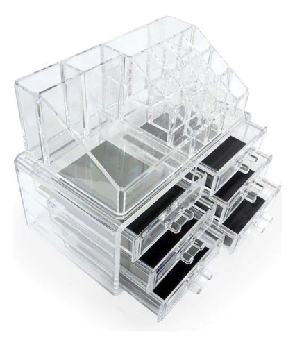 Práctico organizador de cosméticos de acrílico dividido en dos piezas, apilable.
